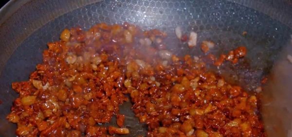 5.起锅倒油,下入猪肉末,煸炒出油脂。