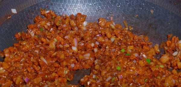7.炒香之后加入葱姜末跟洋葱末,炒香炒至洋葱断生。炒好之后盛出来备用。